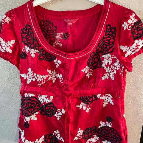 Flott topp i silkechiffon med broderier og paljetter på bærestykket. Ermene har splitt på innsiden.