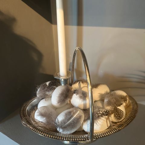 Mange flotte grå påskeegg med fjær selges. Jeg sender gjerne