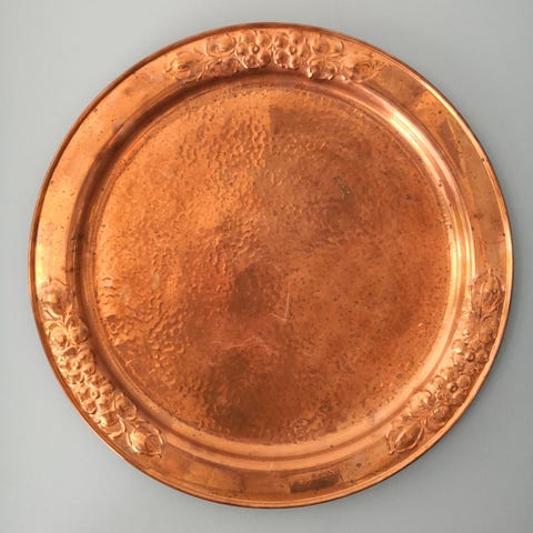 Gammelt kobber brett selges.Det er 59 cm i diameter.Noen bruks merker.Må hentes.