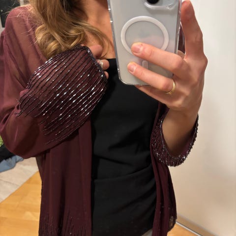 En pen jakke i rød, brun og gull. Ingen lapper på denne. Tynn i stoffet. Type velour. Under arm til under arm er 46cm, hele lengden 59cm. 🌿
