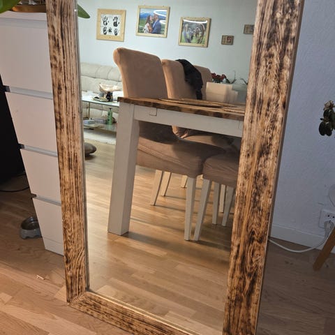 Fantastisk stykke håndtverk , speil fra begynnelsen av 90 tallet av den svenske trekunstneren G. Klarstrøm . Måler 105/58 cm. Sender ikke. Må hentes i Oslo.