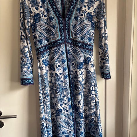 Denne elegante kjolen er designet med et paisleymønster i delikate mørke fargetoner, perfekt for enhver anledning som krever et sofistikert, men avslappet uttrykk. Kjolen har lange ermer med en flatterende perlene preget stolpe foran og en definert midje som skaper en feminin silhuett. Det lette, luftige stoffet gir komfort og bevegelsesfrihet, ideelt for både sommerdager og mer formelle kvelder.
