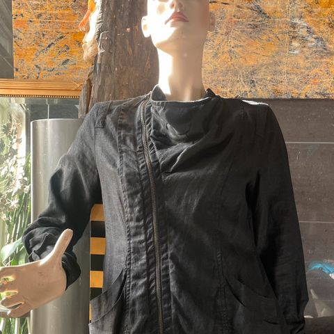 Står S/M, men mer one size. Bryst 77x2, lengde 55. To lommer. Tøff grov bomull (ser ut som grov lin). Mangler en knapp.