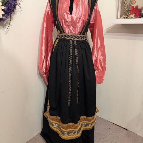 Festdrakt brukt en gang. Selges med jakke, hatt, pannebånd og sølje, mansjettknapper, øredobber. Bunadsko str 39/40 følger med.