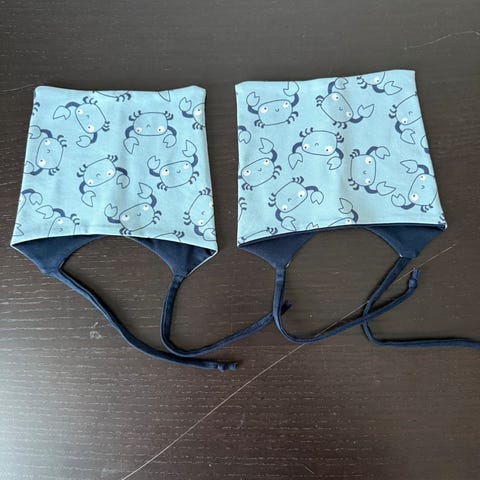 Hjemmesydde luer med snor, str 6-12 mnd.