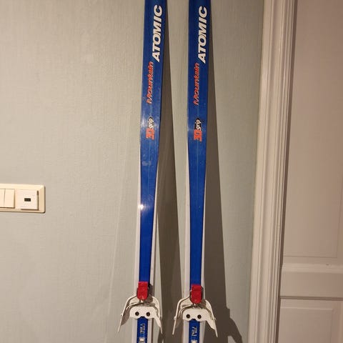 Atomic fjellski med stålkanter, Swix staver - 135 cm. Plast del på hælen mangler. Kan sendes med posten - porto koster ca. 330 kr.