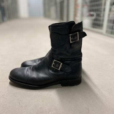 Støvletten er i skinn og koksgrå i farven. Er pent brukt med et lite bruksmerke som kan ses i bilde.