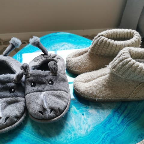 Nesten ubrukt innesko, ull tøffler og Crocs. Brukt bare få ganger før de blir for lite. Selges sammen.