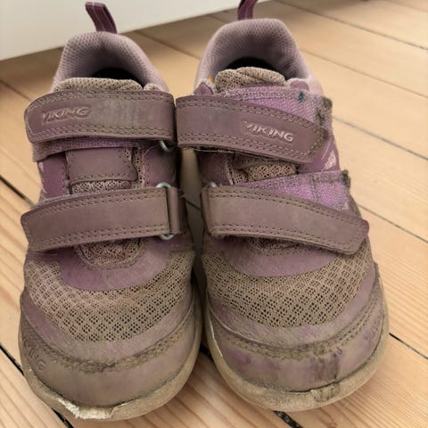 Veme er fine og lette joggesko fra Viking, som kan vaskes i maskin. Noe overflate slitasje foran på skoene, en liten bit mangler på sålen. Fortsatt en del bruk igjen. Brukt en sesong.