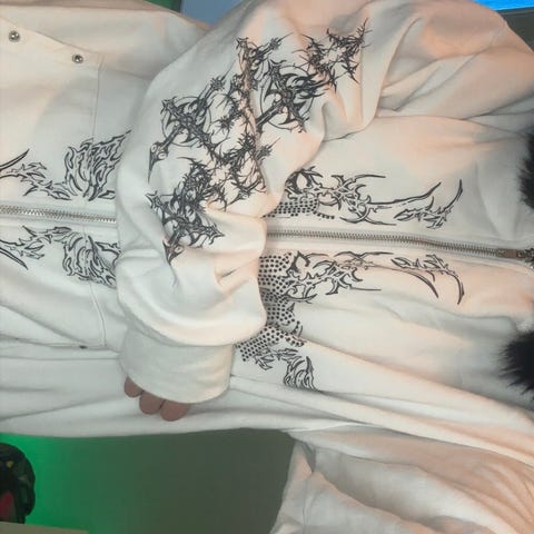 Selger da den ikke blir brukt så mye jeg trodde den skulle. Størrsel xs, men genseren er oversized. Baggen den kom i følger med (siste bilde). Den har fått noen små merker på armene, men tror det kan bli vasket vekk om man gjør det skikkelig.