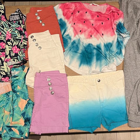 Et sett joggeklær i str 158 i merket WOW, to dongeri shortser i str 152 og 158 og en sommerkjole i str 150. Kan selges hver for seg og, ta kontakt så blir vi enig om en rimelig pris☺️