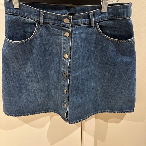 Stillig hvitt dongerikjørt med knyte-detaljer i sidesplitter. 62 cm langt. 78 cm livvidde, omkrets i linning. Glidelås og knapp-lukking. To fremlommer og to baklommer.