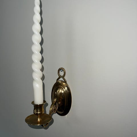 Flott vintage vegglysestake i messing til to lys. Fin, litt rustikk overflate (se bilder). 29x15 cm, den står ca 8 cm ut fra veggen.