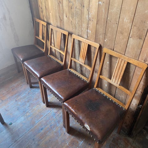 Stolen i bildet er restaurert i setet med bytte av innmat og nye bånd, de øvrige stolene trenger samme utskifting.