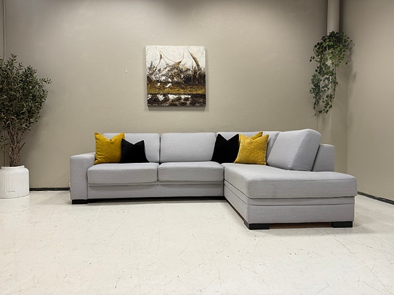 Lekker, moderne hjørnesofa i grått stoff med et minimalistisk design. Perfekt for deg som ønsker både stil og komfort i stua! Sofaen har gode sitteputer og solide treben som gir et skandinavisk preg.