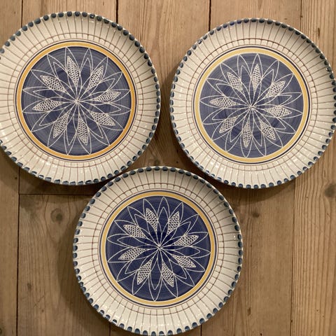 Selger 6 nydelige elle asjetter. De fleste har merke på seg, og de fremstår som nye. De måler ca 20 cm i diameter. Den ene har et mørkere felt, se bilde. Selges kun samlet. Kan sendes mot porto.