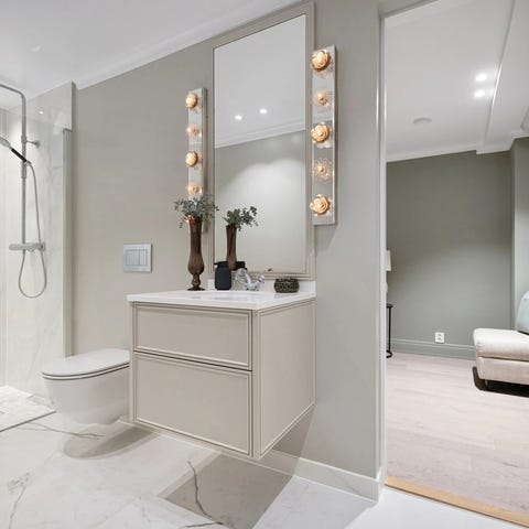 Speil til baderom ( eller andre rom) med stående led- lys på hver side selges. 80 x 75 cm. med komplett oppheng og el. kobling.