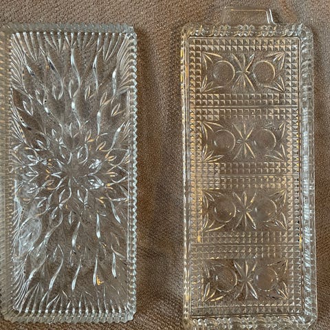 Pressglass fat selges for 145 kroner (bredde 34 cm / dybde 15 cm / høyde 3 cm). K14. Fraktkostnader: PostNord - 69 kroner. Betaling via vipps.