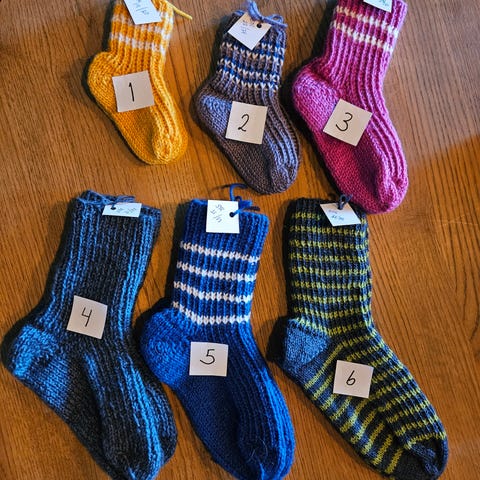 Min kone spinner garn og strikker raggsokker i ren ull, som kommer rett fra bonden.