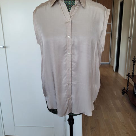 Bluse fra H&M i blankt 97% polyester og 3% elastan i Burgunderbrun farge str 44. Veldig fin og anvendelig bluse i blank polyester stoff. Rett modell med fold i ryggen. En fin og klassisk bluse. Ikke brukt.