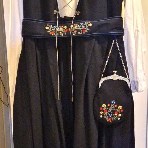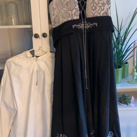 Festdrakten er brukt men har hengt i skapet noen år nå. Den mangler desverre beltet men jeg har brukt beltet som henger på. Se bildet. Selges da jeg ikke passer den lenger. Selger også cap til kr 200 om det er av interesse.