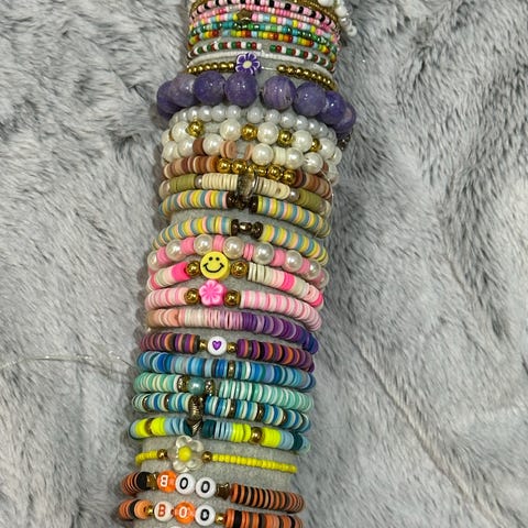 Jeg er 12 år, lager og selger armbånd for å tjene meg penger til sommeren. 20 kr pr stk.