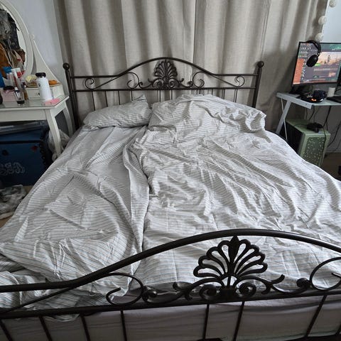 A four poster bed frame (without mattress), mattress will be sold separately: this one is too thick for this frame, I recommend finding a thinner model. Curtains are included, if you want them. A base for the mattress is made of wood.