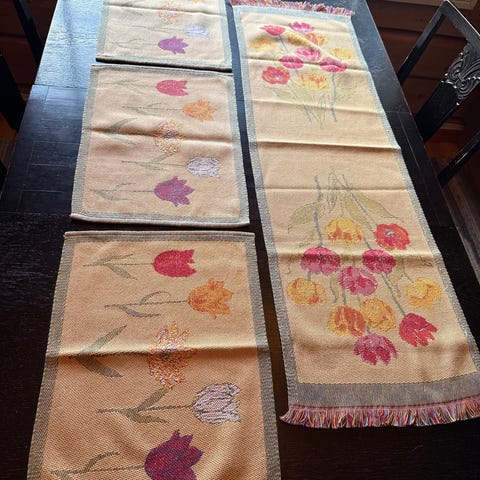 Flott påskebrikke frå Ekelund i bomull. Uten merker etter bruk, bortsett frå at tidlegare eigar har skrive sine initialer på vaskelappen, men dette er ikkje synlig frå utsida. Brikken måler 33 x 46,5 cm og kan brukast til dekkebrikke eller duk - eller ram den inn! Flott påske-/vårmotiv.