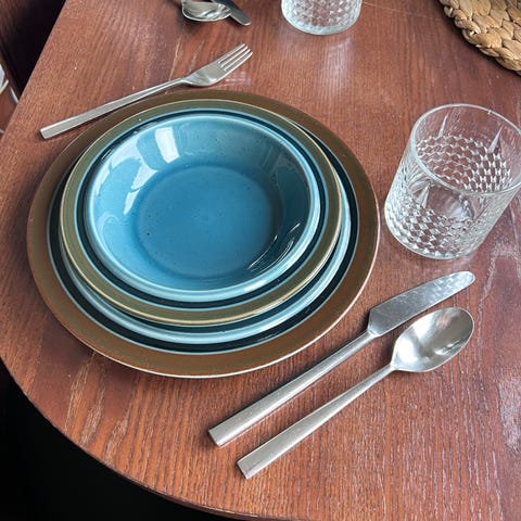 Rustikke Rosenthal Brotzeit ( design Bjørn Wiinblad )keramikk tallerkener (21 cm) bestikk (20 cm)og snapsglass fra 1960 tallet, glasur på noen av tallerkene og noen av snaps glass er litt krakelert et nagg på et glass, vekt på tallerkener er 5 kg, kan sendes, bestikk er solgt