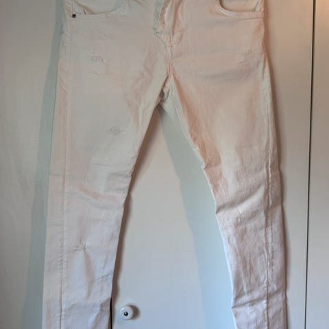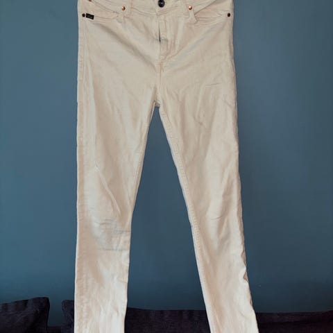 Delikat, lys beige bukse fra LEXXURY med god stretch, str XS/34, passer fra 36- minus 40. Slim model, 5-lommer, små ‘glass’ stener i siden nedenfor frontlommene. En kul bukse som føyer seg lett etter fasongen. Innerbenslengde ca 75-76 cm.