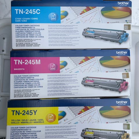 Dette er originale blekkpatroner fra Brother i fargene CYAN (2 stk), MAGNETA (3 stk) og YELLOW (4 stk). Totalt 9 stk.