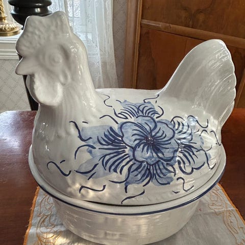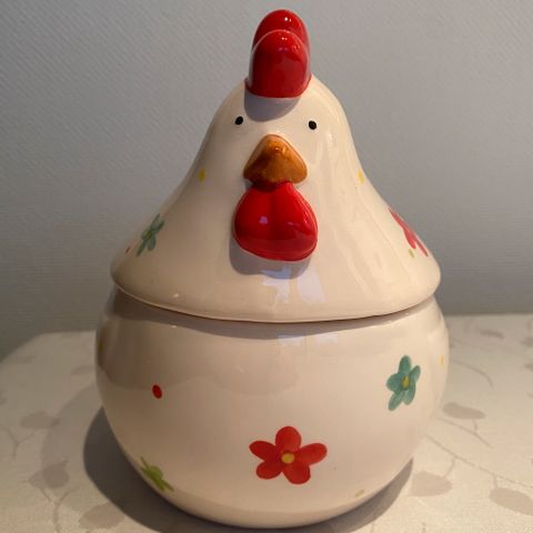 Stor, flott eggehøne med fine farger. Den er feilfri, ingen skår eller sprekker. Lengde ca 25 cm og høyde ca 31 cm. Fin å se til.