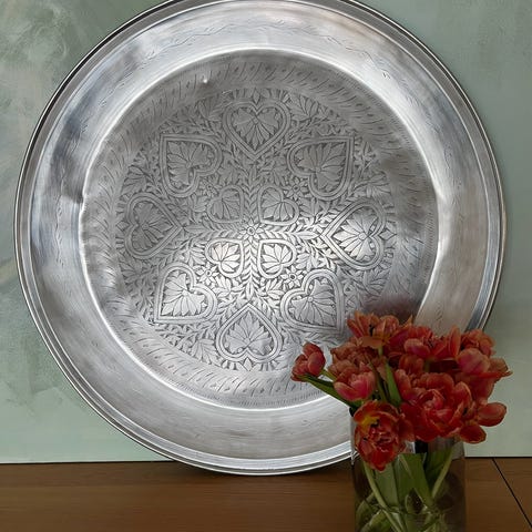 Stilfullt og moderne serveringsfat, pyntefat, fat i metall med dekor. Måler 61cm i diameter og 3cm høyt. Hentes på Torshov. Heis.