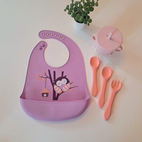 Ubrukt langermet smekke med oppsamler og borrelås. Ugler. Rosa, hvit, lilla.