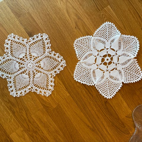 Dukene er håndarbeid, med hekling i ulike teknikker. Den største er 36 cm i diameter, neste er 34 cm i diameter og den minste er 24 cm i diameter. Fine til små bord, under blomsterpotter mm.