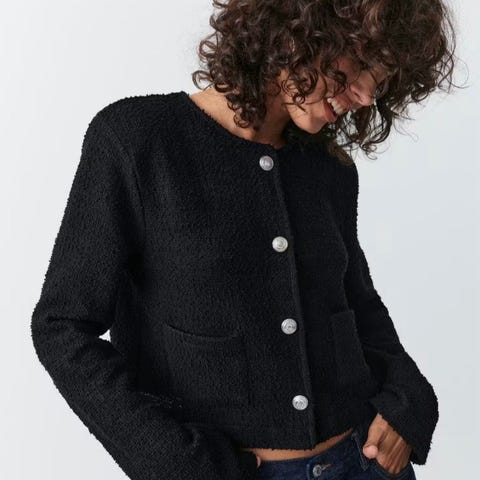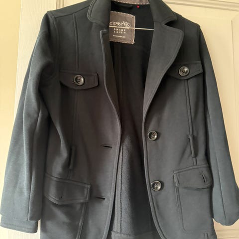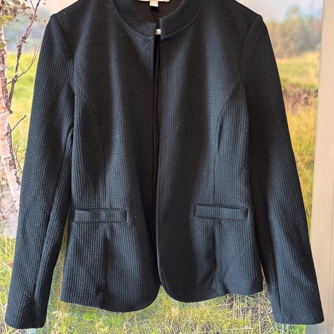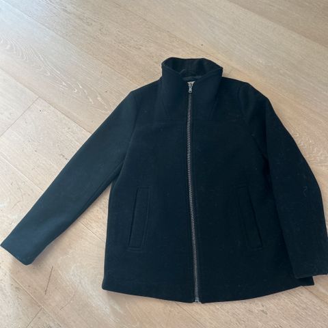 Kort jakke fra Espirit. Svart, bomullfarget og beige melert. Lukkes med en hempe i halsen. Har ikke merke på materiale, men tror det er en blanding av bomull og ull. Størrelse small, vanlig i størrelsen. Pent brukt.