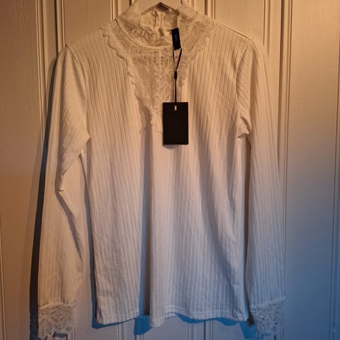 Kremhvit topp med fastsydd skråskjæring foran. Tricotstoff med god stretch. Toppen er ikke brukt, men bør dampes lett da den har ligget trangt i en trådkurv.