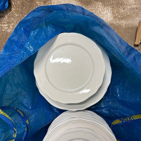 Har 11 små talerken og 11 middagstallerken, ser fin ut, ingen skader. Pris for alt 500