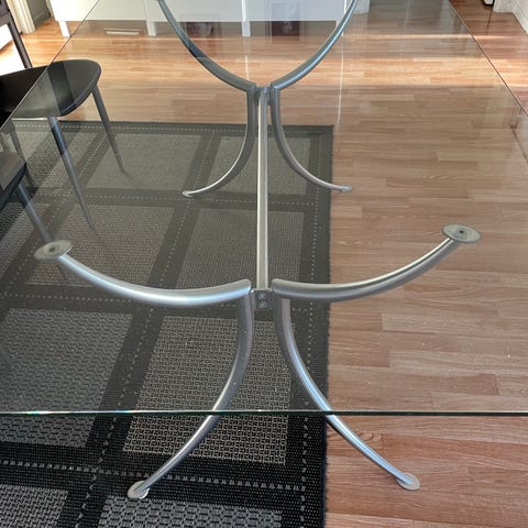 Spisebord i glass og forkrommet stål . Tykkelsen på glasset er 12 mm.