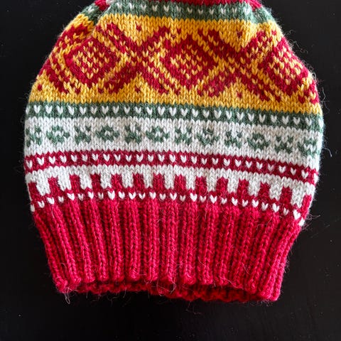 Håndstrikket Marius lue (Kvikk Lunsj) i str 2-4 år strikket i Viking Garn Alpaca Storm