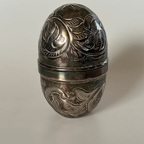 2 hengende egg i tre som har forskjellige motiv skåret ut. De er lette og enkle å henge i vindu eller hvor du måtte ønske.