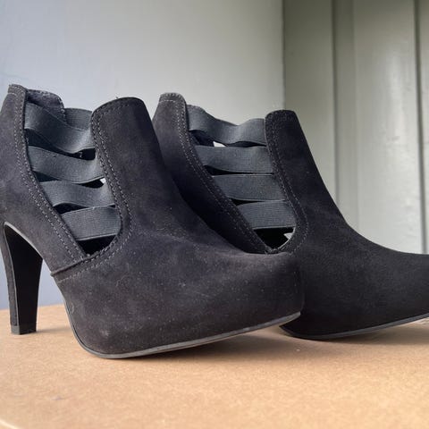 Stilige pensko med gjennombrutt mønster i semsket skinn. Hælhøyde 7 cm