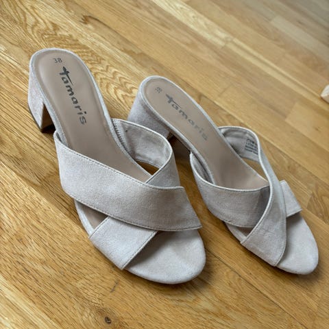 Myke og behagelige, beige sandaler i skinn. Kilehæl på 6 cm.