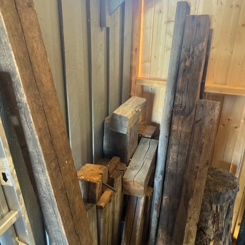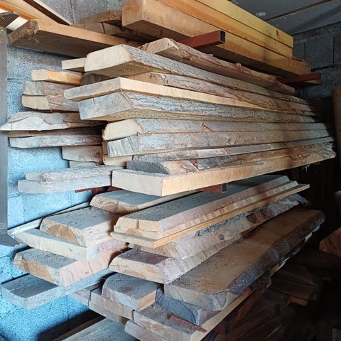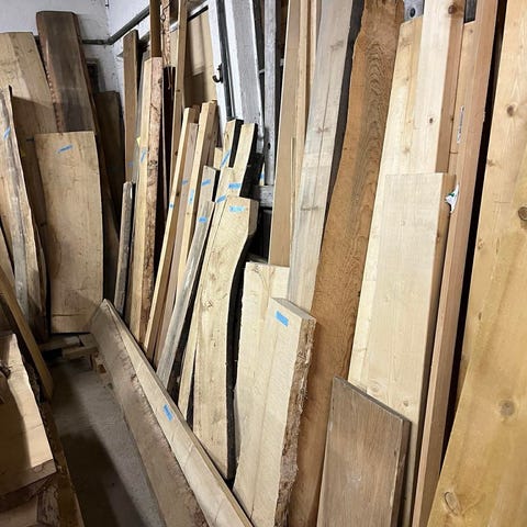 Ulike treplanker i forskjellige størrelser og tresorter, lagret i et verksted. Plankene varierer i lengde, bredde og tykkelse, og kan brukes til ulike snekker- og byggeprosjekter.