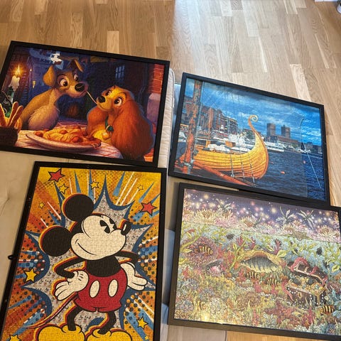 Metallboks med 10 puslespill, 2x1000 biter og 8x500 biter. Puslet èin gang.