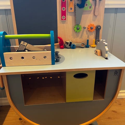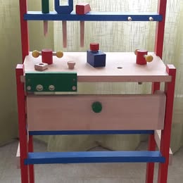 Hjemmelaget snekkerverksted selges til 100 nok siden poden er vokst fra den. Høyde: 86 cm, dypde 42 cm, lengde 80 cm. Høyde fra bordplate: 46 cm