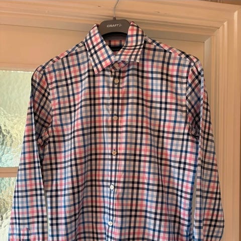 Mål på skjorten; brystmål 53 cmX 2, lengde målt bak 73 cm
