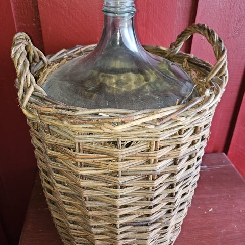 Gammel vinballong i kurv. Grønnturkis farge i glasset. Gummikork er nok litt skjør og kanskje finest å fjerne?