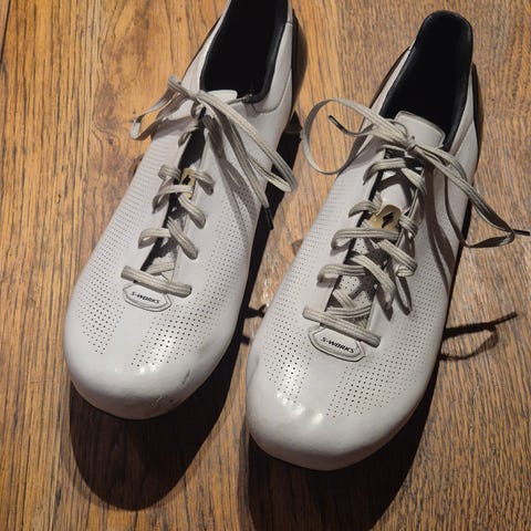 Sykkelsko av skinn, fra Dromarti. Helt utrolig gode, og fine, sko. Har brukt Dromarti i mange år, og har både road og terreng. Siste par jeg kjøpte hadde en feil i klossefestet, men jeg fiksa det før disse nye kom fram. Dette er med andre ord helt klin nye sko, kjøpt i år.