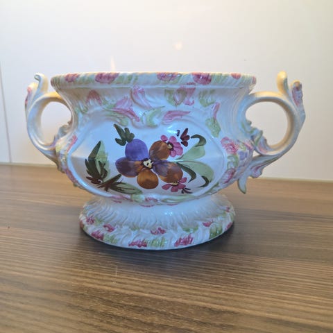 To stykker store keramikk krukker merket Bassano.Håndmalt blomstermotiv.Begge er i veldig god stand,ingen riper eller skår.Måler 15 cm i høyde,og 14 cm i bredde på det bredeste.Ikke prut!